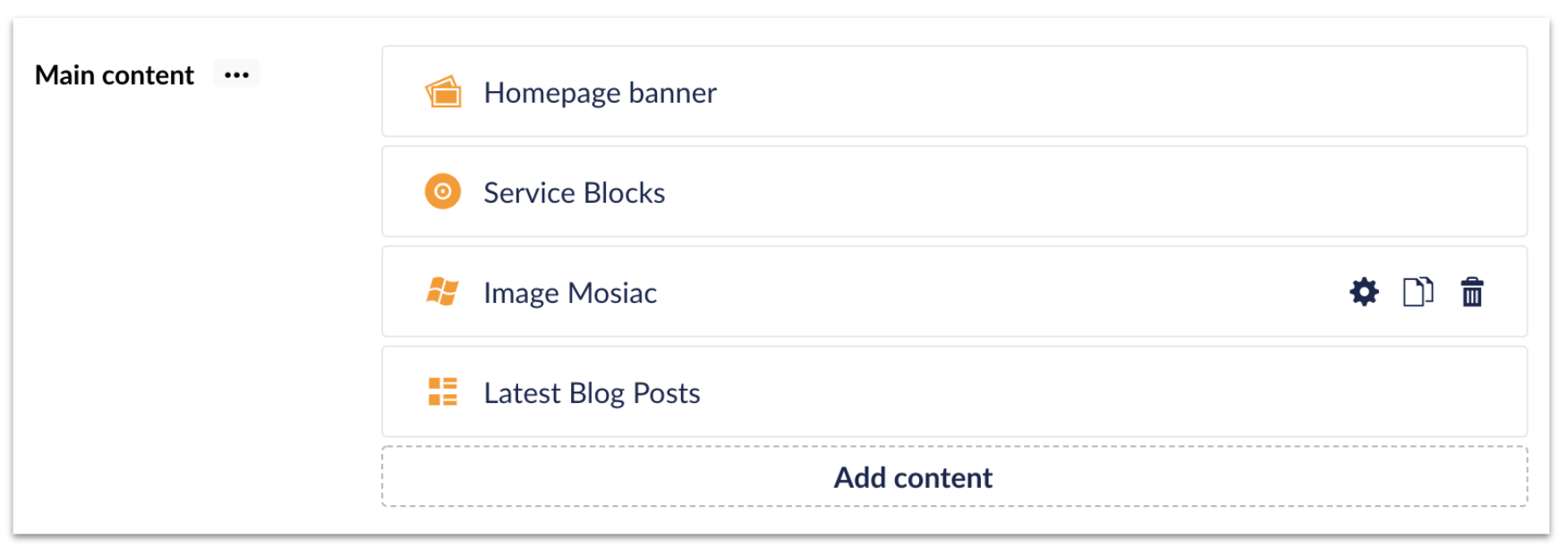 Content block editor. Easily update individual content blocks on a page and rearrange them as needed. The drag and drop functionality allows users to pull in necessary content blocks without the need for a developer.