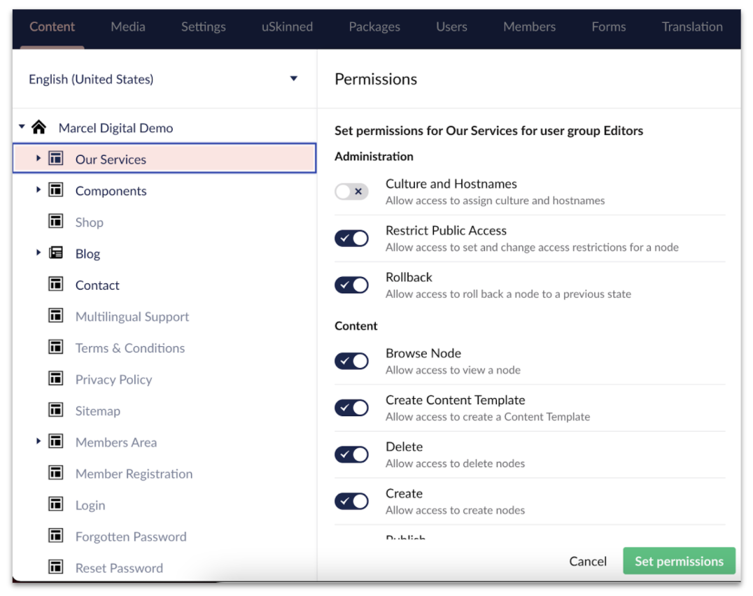 User permissions & publishing options. Umbraco gives you full control over granting specific access to editors and user groups. This means giving the right permissions to the right users without worrying about micromanaging or arduous approval processes.