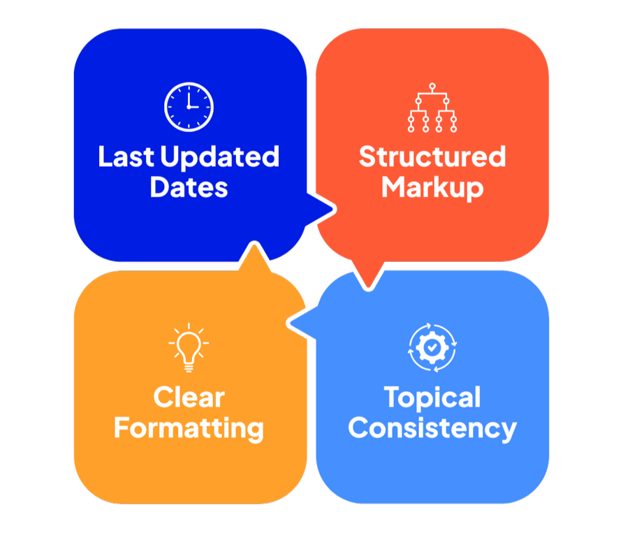 Content with visible update dates or last-modified metadata is more likely to be pulled into AI responses. These signals tell the engine that the content is being maintained and may include the most current information.
