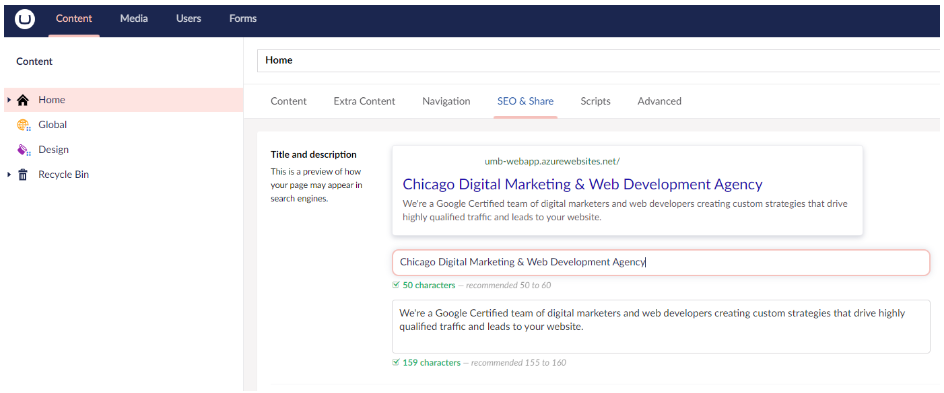 uSkinned provides SEO tools out of the box to help you reach the top position in search results. These are built-in and do not need to be installed as a separate feature. Build your site with confidence, knowing that you are designing it with attention to optimization.