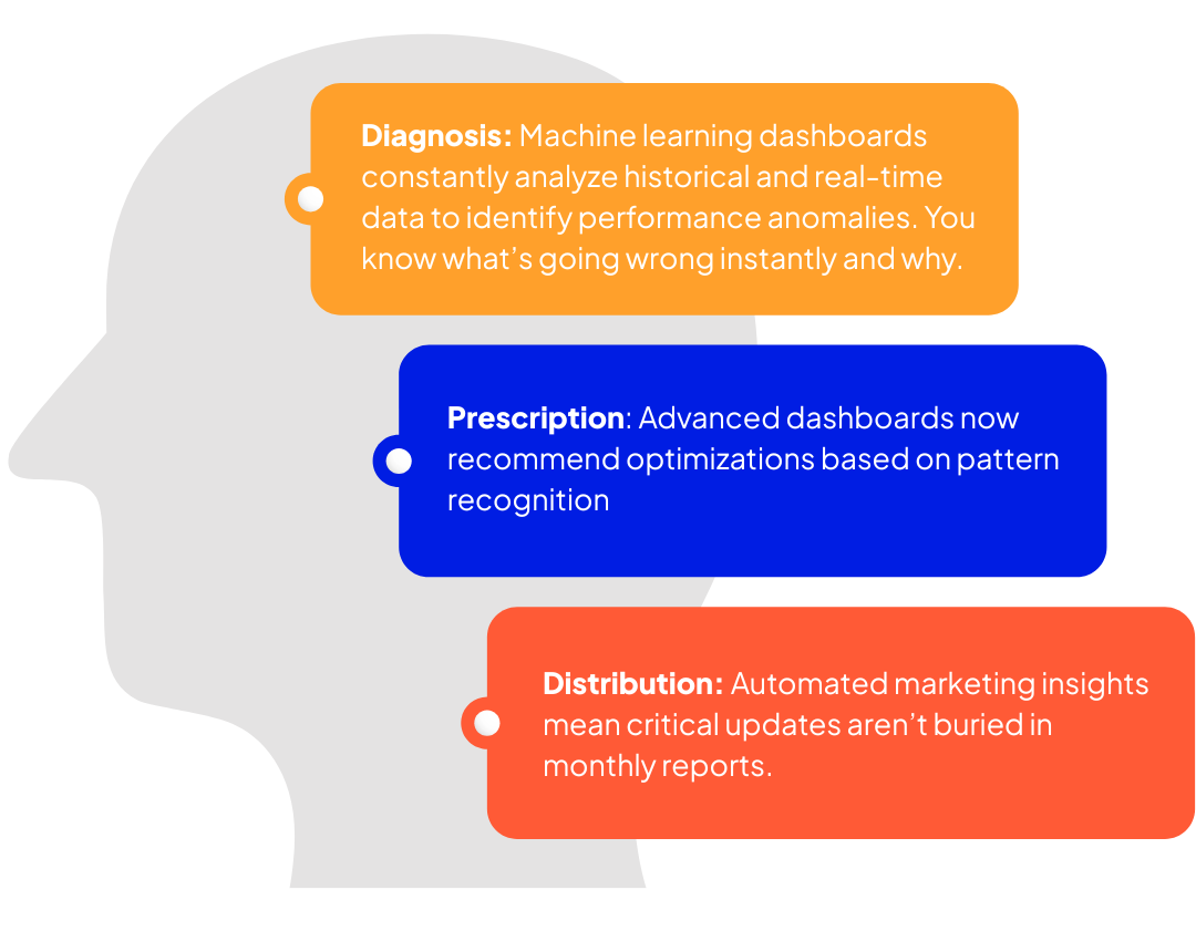 Diagnosis: Machine learning dashboards constantly analyze historical and real-time data to identify performance anomalies (spikes, dips, broken UTM tracking). You know what’s going wrong instantly and why.