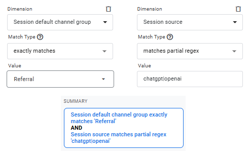 The name of the session source has changed to “chatgpt” so to see all historical traffic, you want to include the old session source name “openai”. This partial regex will capture traffic from both source names.