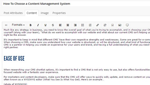 For marketers and content developers, make sure that the CMS will offer ways to quickly edit, update, and remove content on your website. This is a standard feature of most CMS and is often known as a WYSIWYG editor (What You See Is What You Get). Here’s an example…
