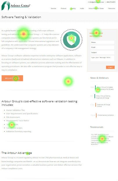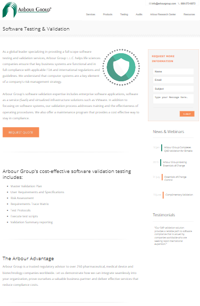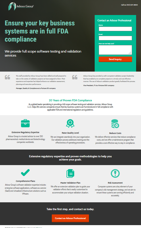 Our goal with the Arbour Group project was to increase leads through their landing pages for services and products they offer. The goal of these pages are to inform life science companies, such as those in pharmaceuticals, medical device testing, biotechnology, and diagnostics, about their master validation processes and to collect leads via a form that lives on the right side of the page.
