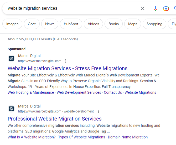When your website is ranking for a non-branded search query, having a paid search ad at the top further instills confidence for users that you are experts in the area. For example, for the term “website migration services”, Marcel Digital ranks top of the SERPs. When our paid search ad is shown, we are able to take up the majority of the first fold, telling users that we are the top choice for this service and diverting them from the competition.