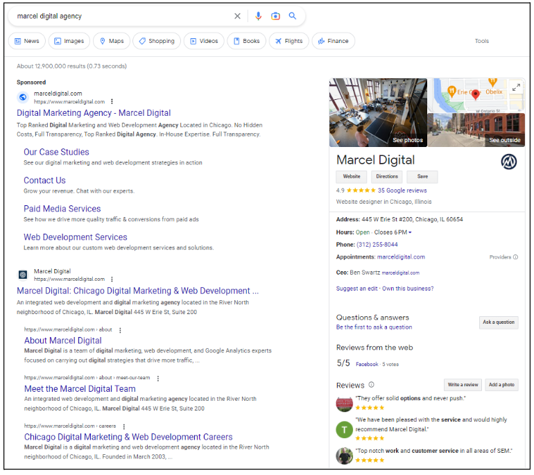 This is also a popular strategy for branded keywords. In the example below, you can see Marcel Digital takes up the entire first fold of the search result page for queries like “marcel digital agency,”, with an organic result, paid search ad, and a Google Business profile.