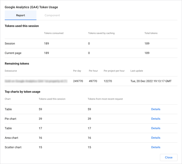 As of December 20, 2022, Google released an update that allows users to view a report’s GA4 usage data. While in edit mode, right-click on a GA4 chart and select “Google Analytics token usage” which will bring you to this dialog box:
