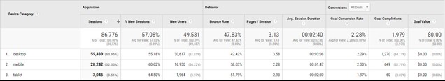 In the above image, I’ve broken out paid traffic by device type. When you dig one level deeper, you can see that paid traffic views half as many pages, spends half as much time on the site, and converts 60% less than desktop. It would be logical using this data alone to optimize your ads towards desktop.