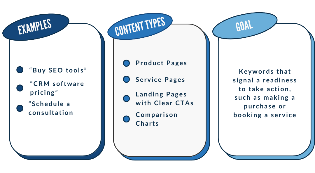 Examples: “Buy SEO tools”, “CRM software pricing”, “Schedule a consultation”.
