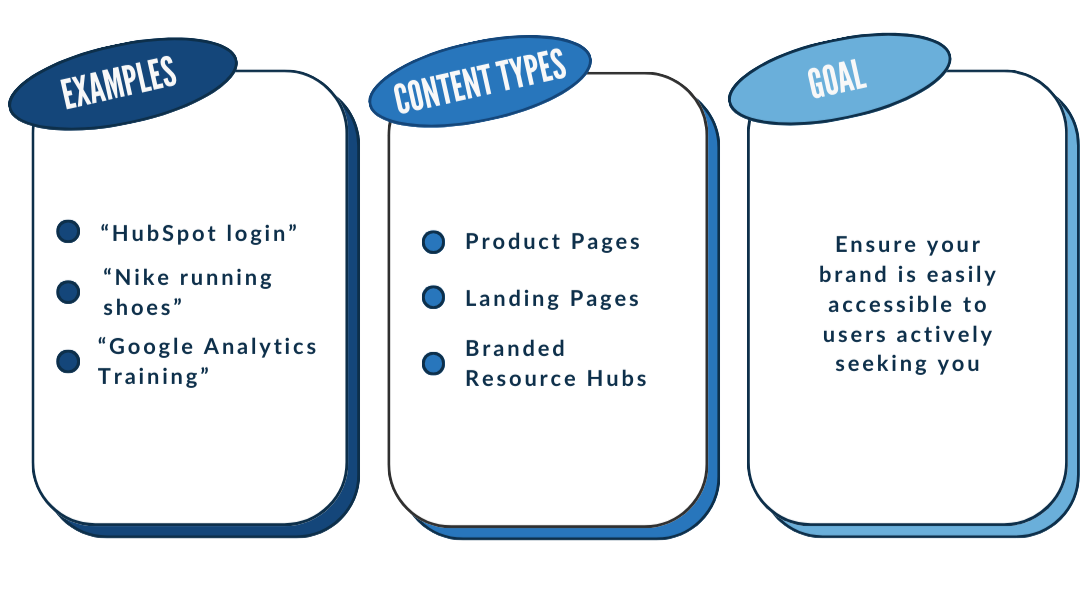 Examples: “HubSpot login”, “Nike running shoes”, “Google Analytics training”.
