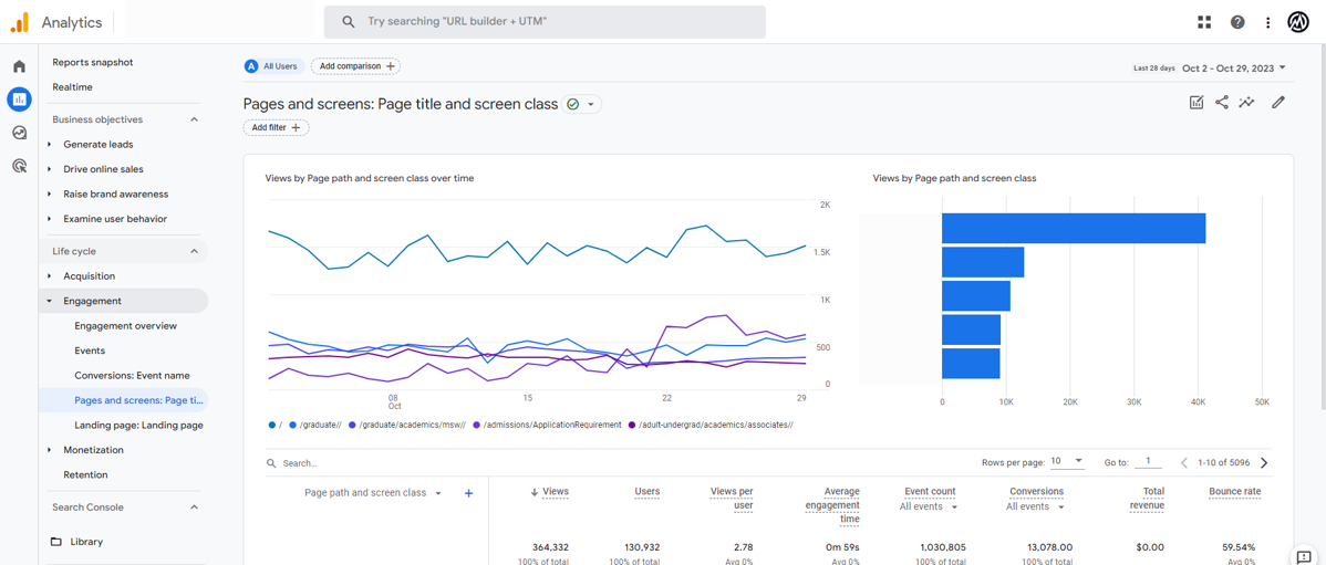 In GA4’s Pages and Screens Report, you can see which pages are most visited, how many conversions were completed on that page, and how much time the user spent engaging with that page. This data is helpful in understanding what content on your site is most popular.