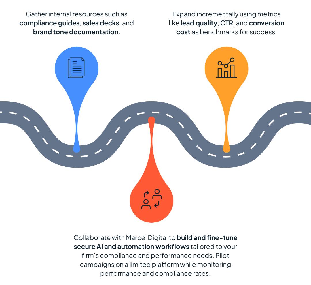 Collaborate with Marcel Digital to build and fine-tune secure AI and automation workflows tailored to your firm’s compliance and performance needs. Pilot campaigns on a limited platform (e.g., LinkedIn) while monitoring performance and compliance rates.