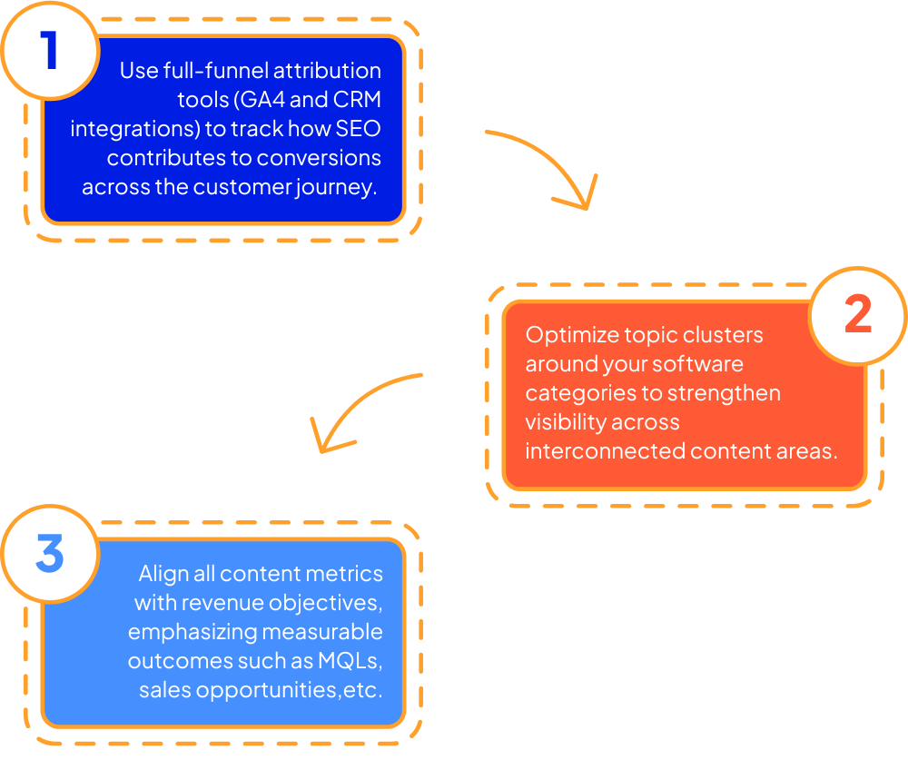 Next, optimize topic clusters around your software categories to strengthen visibility across interconnected content areas. Integrate CRO and UX improvements to remove friction in the conversion process and ensure that every visitor has a clear path to engagement.