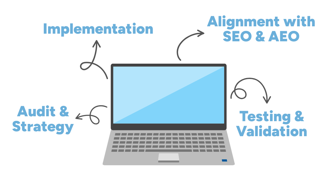 We start by evaluating your current content and technical setup to identify where structured data can make the biggest impact. From service pages to blog content to knowledge bases, we map out an intentional schema approach that reflects your business priorities.