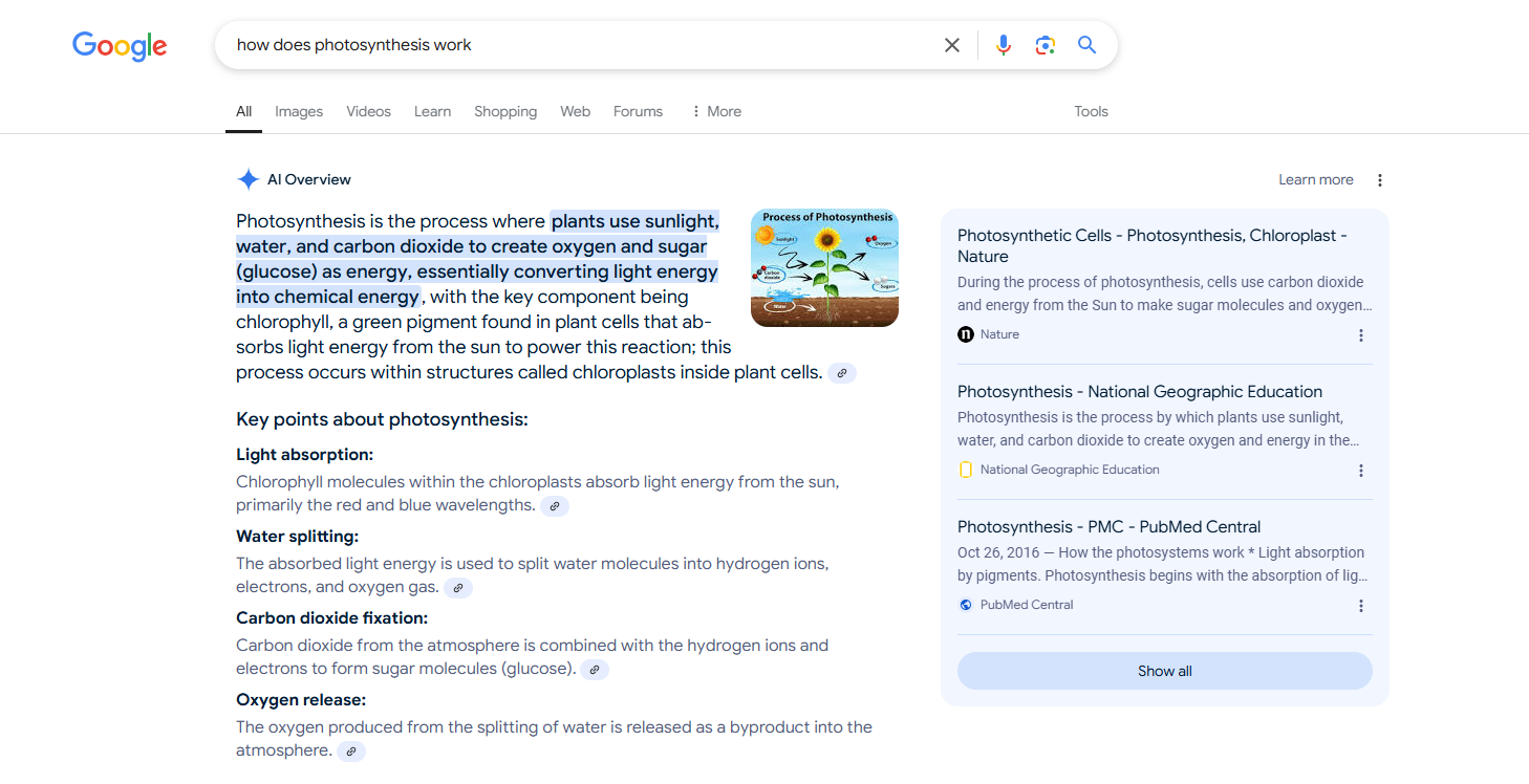 How does photosynthesis work → AI Overview appears