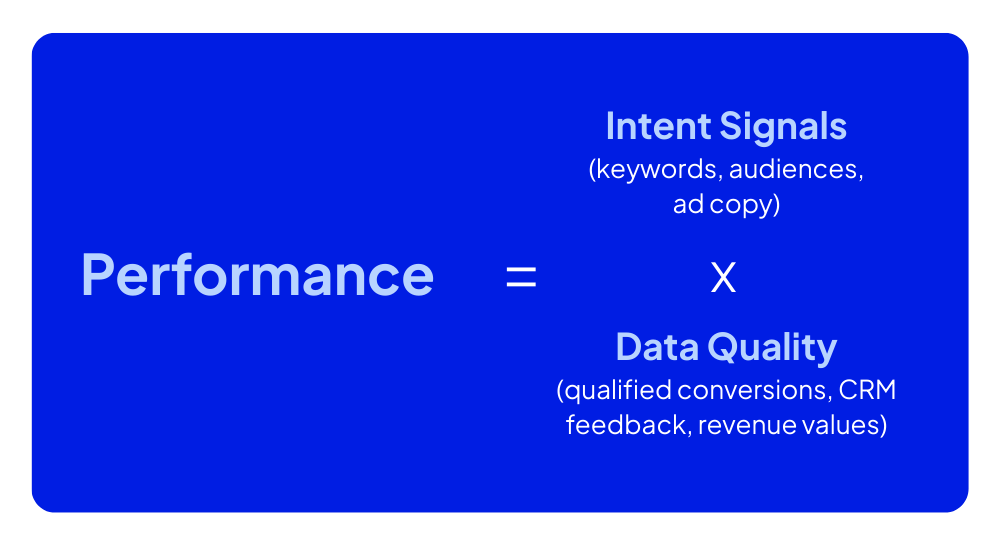 Data quality - conversion signals that tell Google what success looks like, including qualified leads, CRM outcomes, and revenue values.