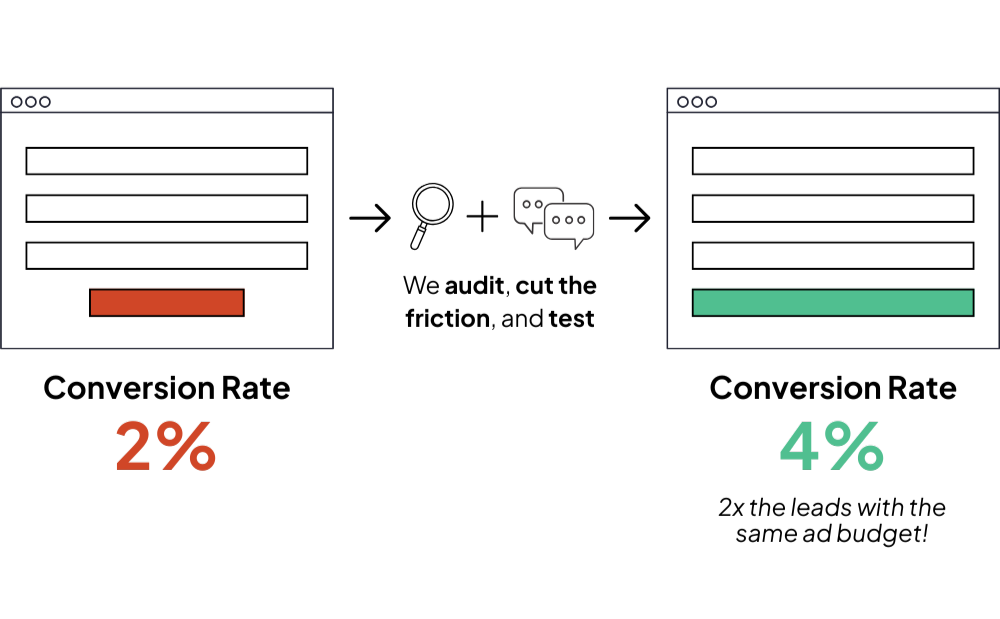 Your form converts at 2%. We audit it, cut the friction, and test new copy. The winning version lifts conversions to 4%. That’s twice the leads with the same ad budget.