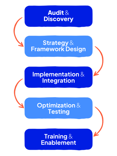 Implementation & Integration: We connect CRMs, analytics tools, and data warehouses to create a single source of truth.